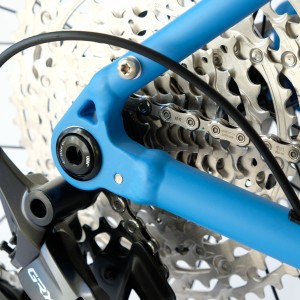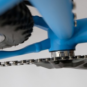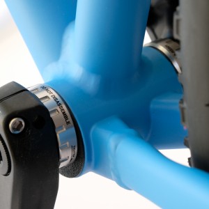 Nově tvarovaná "spojka" středového složení umožňuje vedení bowdenů v rámu. Rám je připraven pro teleskopickou sedlovku.